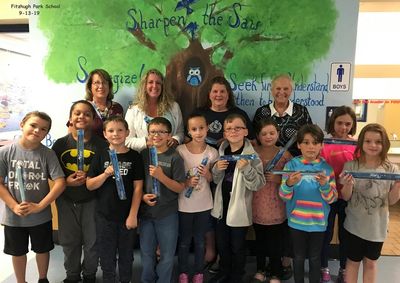 The Oswego Music Hall of Fame donated 100 Buccaneer Blue Recorders to the Fitzhugh Park Elementary School. Pictured with students from Mrs. Vashaw, Mrs. Dumas and Mr. Tossa's 3rd grade students are Principal Donna Simmons and Board members Missy Klefbeck, Nancy Spereno and Lee Audlin. (2019)